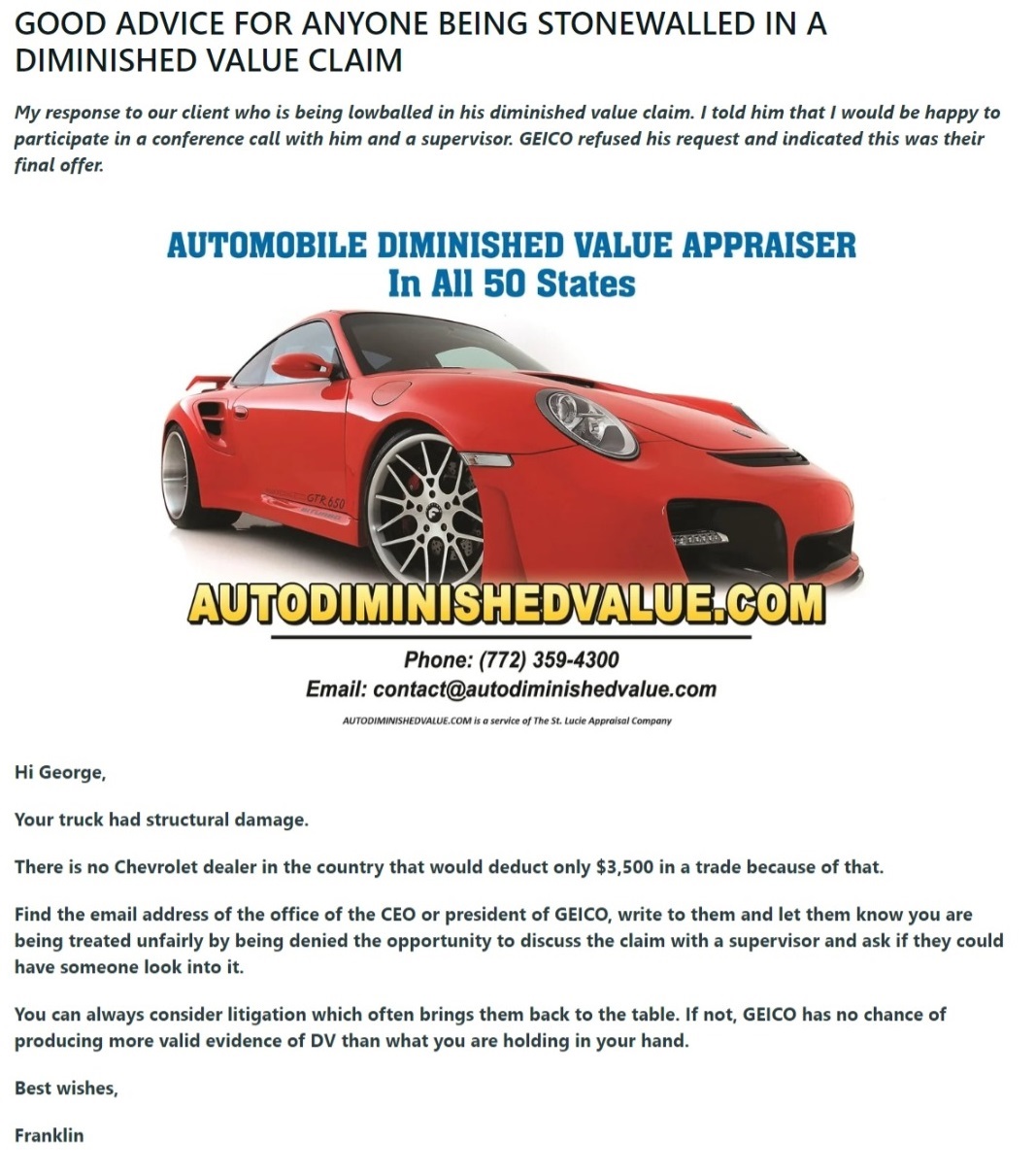 a response to a GEICO lowball offer for diminished value