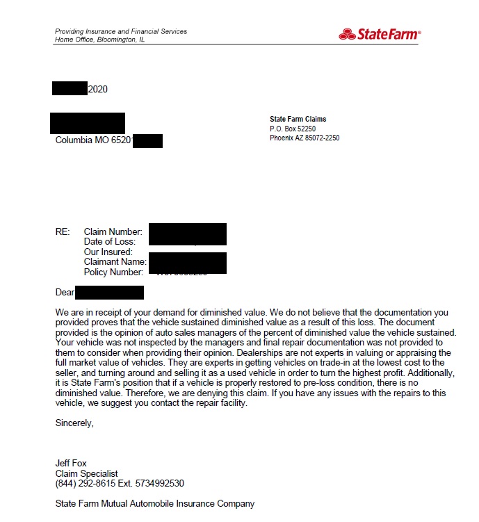 As a result of our research, it was determined that the Tesla lost about 35% of its pre-accident value; more than $22K. The vehicle owner presented our auto diminished value appraisal and demand letter to State Farm. The insurer’s file handler produced this letter of denial to our client.